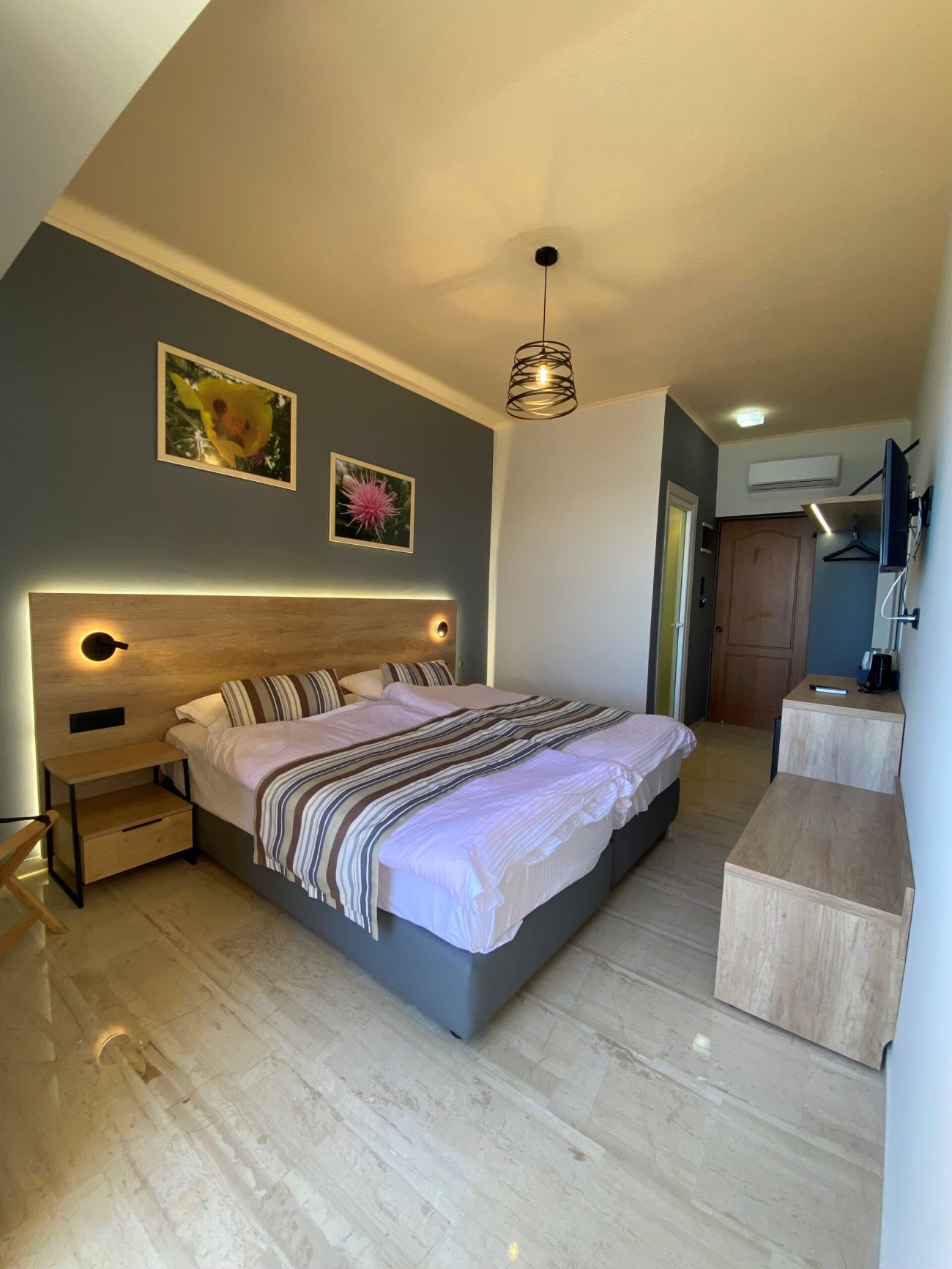 All rooms have air conditioning, wifi, hairdryer, kettle, fridge, satellite TV. The studio also has a kitchen.